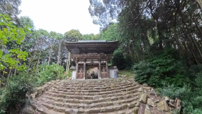A nationally designated Important Cultural Property featuring a two-story gate and guardian statues. Experience the scale and presence of the elevated stairway space in 360°.