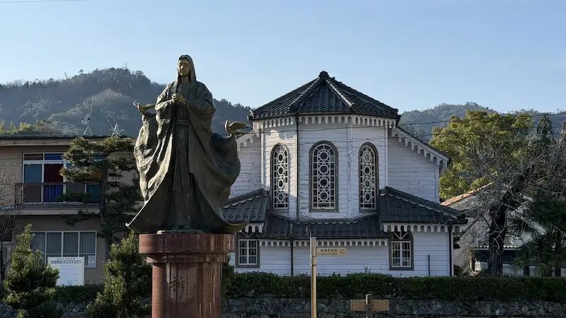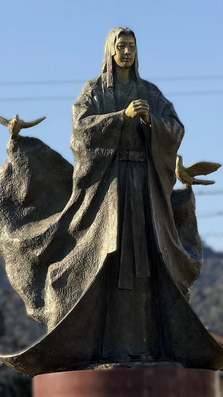 On the banks of the Ōtegawa River, beside the Catholic Miyazu Church, stands the Hosokawa Gracia statue “Prayer.” It was erected in November 2013 (Heisei 25) to commemorate the 450th anniversary of the births of Hosokawa Tadaoki and Lady Gracia. The design makes it feel as if her garment hem flutters in the river breeze, and the statue is positioned to gaze toward Miyazu Castle, where she is said to have lived. With the theme of “prayer,” it portrays Tama (later Gracia) wishing for lasting happiness for the Hosokawa family and the people of Miyazu. The sculpture was created by Shinsuke Yamamoto (a member of the Japan Art Academy), and the inscription was written by Morihiro Hosokawa, the 18th head of the Hosokawa family. When you remember the life of a woman who received the name “Gracia” (meaning “grace”), you’ll likely want to pause here and fold your hands in quiet reflection.