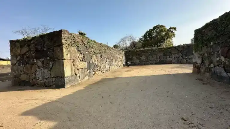 国道2号の車音がかすかに届く南側に、石垣の“口”がぽっかりと開いた場所があります。ここが鵰門跡(くまたかもんあと)。中曲輪に設けられた十一門のうち、遺構がもっともよく残り、往時の姿を想像しやすい門跡だと紹介されています。枡形に踏み込んだ敵を、石垣上にそびえた櫓門から狙いすまし、外門を破って勢いづいた相手さえ侵入を阻まれ、三方から打ち込まれる——そんな“攻めさせない城”の意地が、門の建物が消えた今も石の折れと幅で伝わってきます。