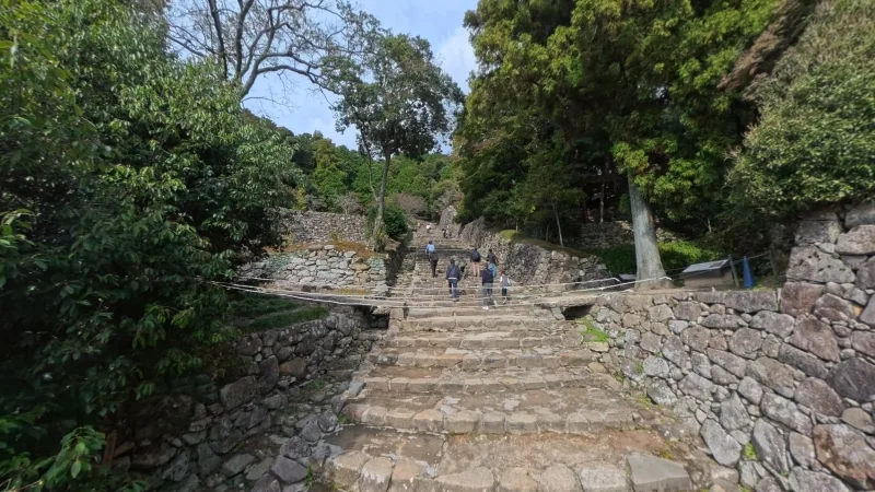 - 石段の直線美:幅約6メートル、全長約180メートルにわたる直線的な石段は、他の城郭には見られない独特の設計です。