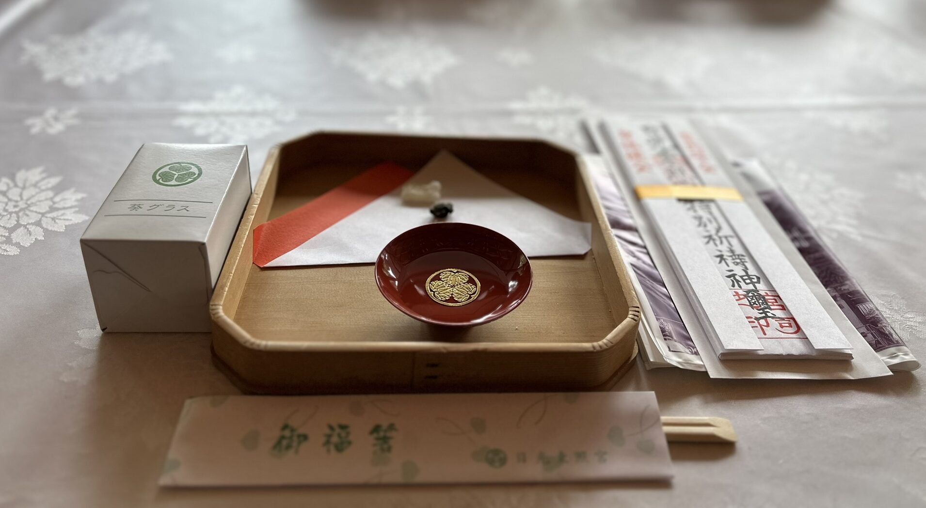 最後に社務所に戻り、神前に供えられた神饌(食べ物や御神酒)を分かち合う儀式に参加しました。神と人とが一体となる感覚に心が震え、この旅の大きなハイライトとなりました。その後、御神札や朱盃、葵グラス、福箸といった記念品を授与され、心身ともに満たされた状態でツアーは幕を閉じました。