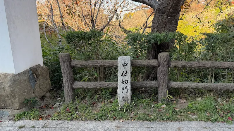 史跡案内図で「中仕切門跡」として位置が示されています。