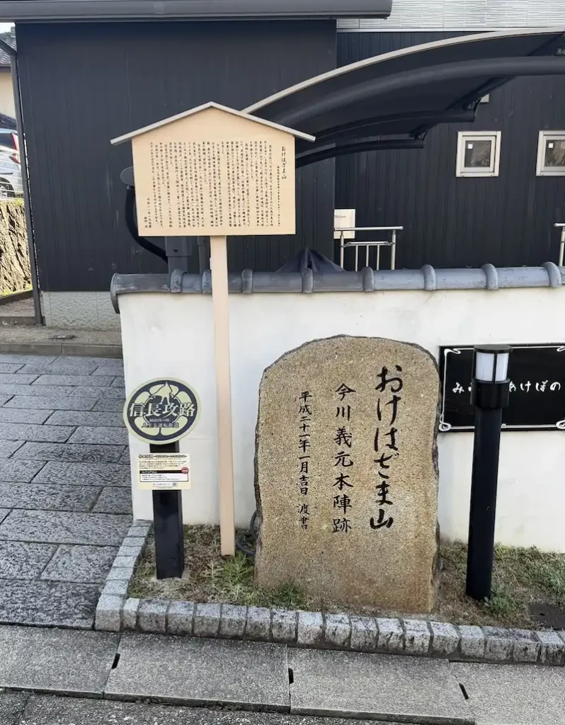 - 今川本陣跡碑:義元が陣を敷いたと伝わる場所を示す石碑。