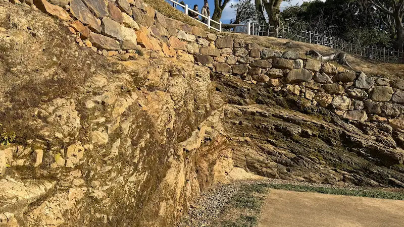 - 土塁の層構造:土・砂・小石のレイヤーが幾層にも重なる様子がはっきり視認でき、築城当時の工夫が分かります。