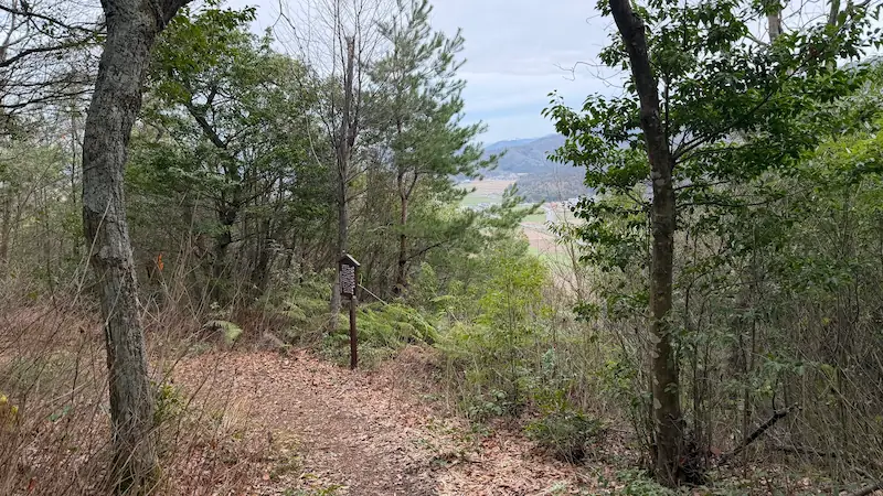 展望所から河毛駅へ向かう北側への下山路は、急坂が続く区間があります。雨天後は足元が滑りやすくなるため、運動靴と注意が必要です。距離は約1km、徒歩約15〜20分が目安です。